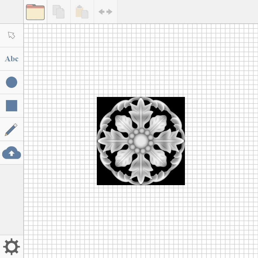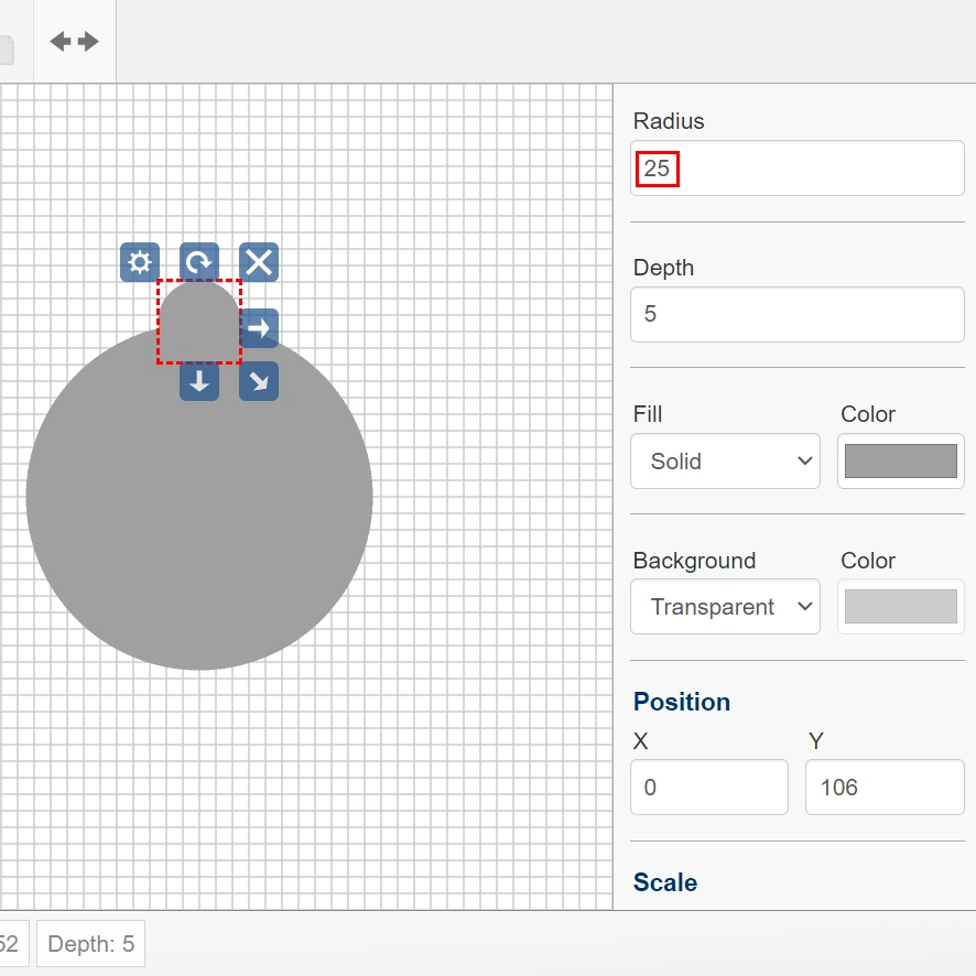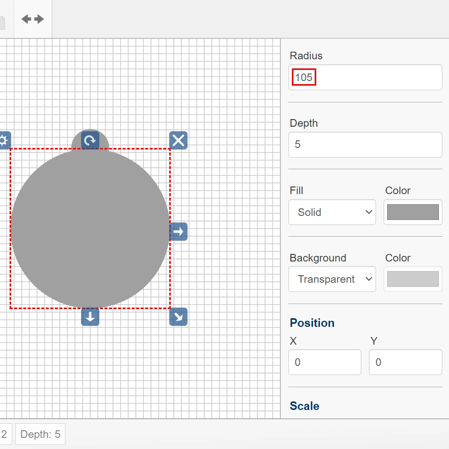 A kezdéshez a bal oldali eszköztár Kör gombjával adjunk hozzá egy kört, majd kattintsunk a konfigurációs gombra a sugár beállításához. Ennél a képnél a sugarat 105 mm- re állítjuk be, ami nagynak tűnhet, de ezt le is kicsinyíthetjük, amikor kinyomtatjuk. A konfigurációs panelen az alap vastagsága 5 mm -re is beállítható a Mélység mezőben; ez ismét módosítható és később szükség szerint méretezhető.