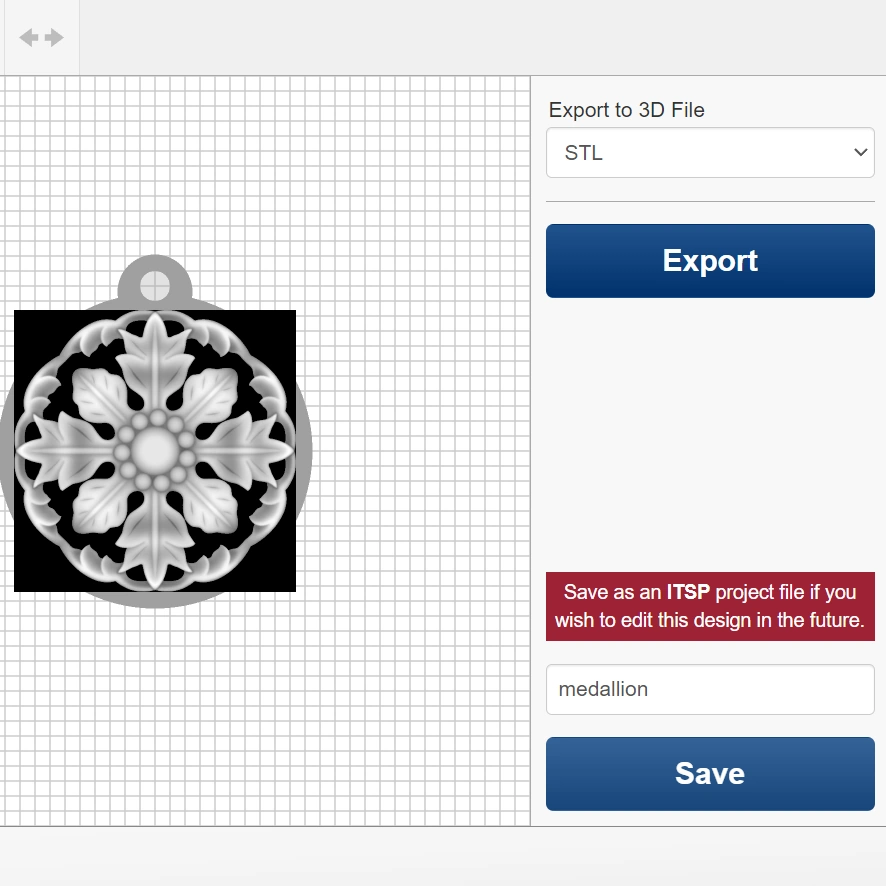 A táskában lévő dizájnnal most a fájl mentésére fordítjuk a figyelmet. Ha az eszköz jobb felső sarkában található Mentés gombra kattint, lehetősége van a terv exportálására vagy mentésére. A terv mentése egy ITSP fájl olyan formátumban menti el, amely lehetővé teszi a terv újratöltését és szerkesztését a jövőben. Az Exportálás gomb elmenti a tervet a jelenleg támogatott számos 3D modell formátum egyikébe. Mivel 3D-s nyomtatást fogunk végezni, a tervet exportálni fogjuk a STL formátum amely biztosítja, hogy a 3D nyomtatási szeletelő szoftverünkkel meg lehessen nyitni.