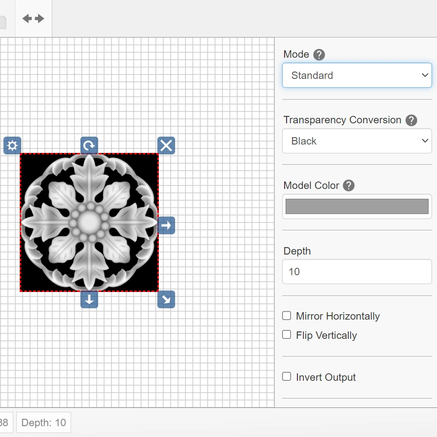 A konfigurációs beállításokon belül a Mode beállítást Standard értékre, a Mélységet pedig 10 mm-re állítjuk. A mélység beállítható úgy, hogy a megemelt terület magasabb vagy alacsonyabb legyen, az Ön képétől és preferenciáitól függően.