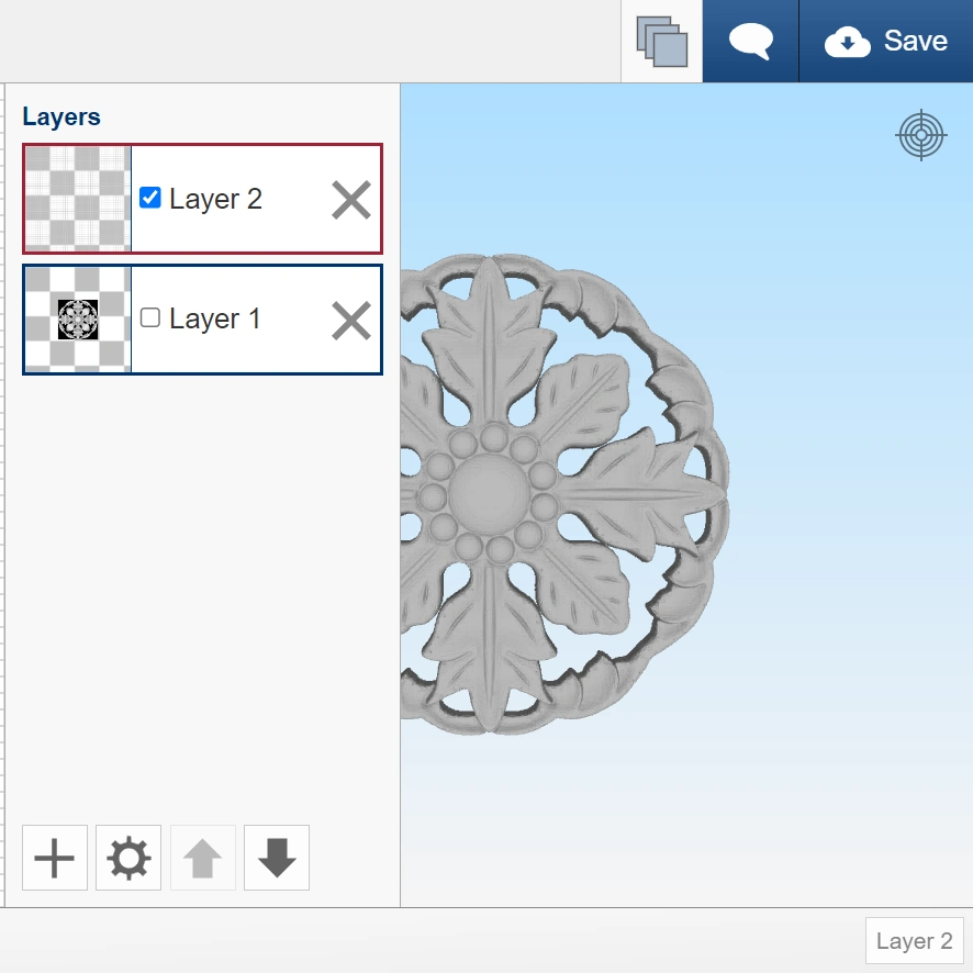 A kép hozzáadásával létre kell hoznunk egy új réteget, amelyet a kulcstartó alap létrehozásához használunk. A 3D szerkesztő rétegei hasonlóak a népszerű 2D képszerkesztő szoftverek rétegeihez, és lehetővé teszik a 3D elemek egymásra helyezését. Kulcstartónk 2 rétegből fog állni: az 1. rétegből, amely a megemelt magassági térképet tartalmazza, és a 2. rétegből, amely a kulcstartó alapot tartalmazza és az 1. réteg alatt helyezkedik el.