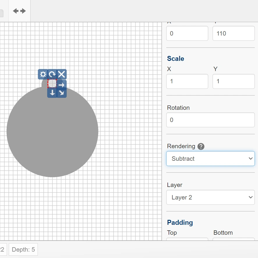 Mivel azt szeretnénk, hogy ez a kör lyukat készítsen az előzőleg hozzáadott körön, ezért a Rendering módot Kivonásra állítjuk, így ahelyett, hogy hozzáadnánk a 3D modellhez, ez a kör lyukat hoz létre a modellben, ahogy az a 2. képen is látható. lent.
